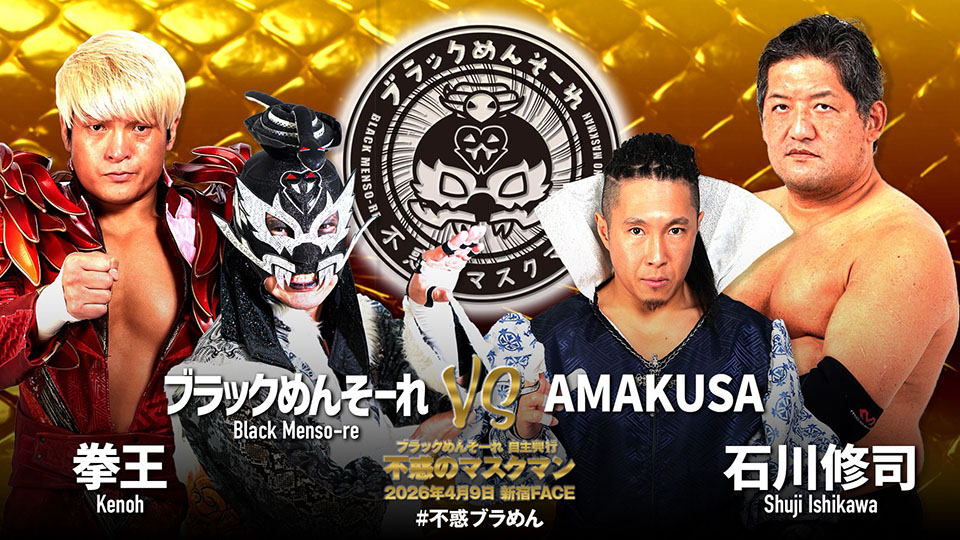 ブラックめんそーれ自主興行4・9新宿大会『不惑のマスクマン』の開催、第1弾カードが決まった。 めんそーれは2018年8月、全日本で誕生したマスクマン。現在、NOAHにフリー参戦。前半戦の人気者として活躍する一方で、現在、AMAKUSAとのコンビ“AMAKUSHA---!!!"で『NOAH Jr. TAG LEAGUE 2026』に出場している。 そして今春、新宿FACEで自主興行を開催。この日、第1弾カードがYouTubeチャンネル『拳王チャンネル』内で発表され、めんそーれが拳王と組んでAMAKUSA&石川修司と対戦するタッグマッチが決まった。 ☆4/9(木)東京・新宿FACE『ブラックめんそーれ自主興行「不惑のマスクマン」』18:00開場、19:00開始 ▼タッグマッチ 石川修司 AMAKUSA vs 拳王 ブラックめんそーれ [チケット料金] ・最前列:12000円 ・カウンター席:12000円 ・二列目:10000円 ・指定席A:8000円 ・指定席B:5000円 ※チケット販売:チケットペイにて、発売中